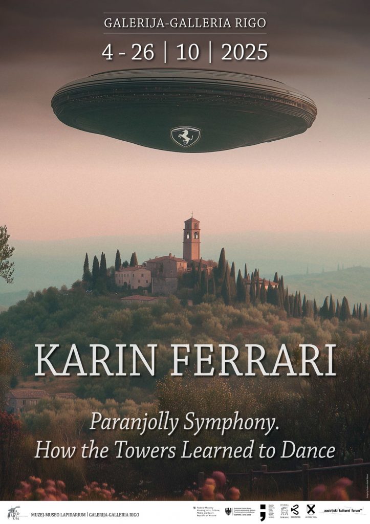 Museum Lapidarium / Rigo Gallery Novigrard 04.10. - 26.10.2025 Rigo Gallery presents Paranjolly Symphony, a new exhibition by Karin Ferrari that explores the ambivalent symbolism of towers - oscillating between defense and devotion, control and transcendence. Following earlier projects like New York City's roof temples and wellness-hotel cult sites in South East Asia, Ferrari discovered another compelling subject in Istria, Croatia: historical watchtowers later repurposed as chruch towers. This research began during her 2023 Krinzinger Artist Residence in Kuberton, Croatia. More Info For the exhibition, a new sound installation with a spoken word track has been created in collaboration with Juniper Foam. An exhibition catalogue will be published with texts by Jerica Ziherl, Paul-Henri Cambell and Karin Ferrari With support by the Austrian Cultural Forum Zagreb, the Federal Ministry of Arts, Culture, the Civil Service and Sport of the Republic of Austria, and the Departement of German Culture of the Autonomous Province of Bolzano - South Tyrol. Poster created within the context of the BMKOES research grant AI in the Arts.